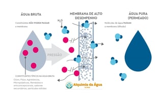 Membrana Semipermeável: Essa membrana especial permite apenas a passagem de moléculas de água, bloqueando contaminantes como sais, bactérias e outras impurezas.